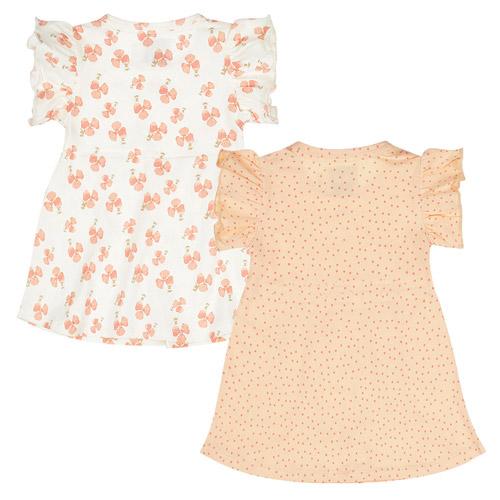 De jurk heeft een basis kleur off-white versierd met een oranje bloemenprint.