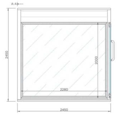 Façade sans joint apparent, porte vitrée latérale avec poignée en D et fenêtre symétrique opposée en double vitrage clair trempé avec cadre en aluminium.