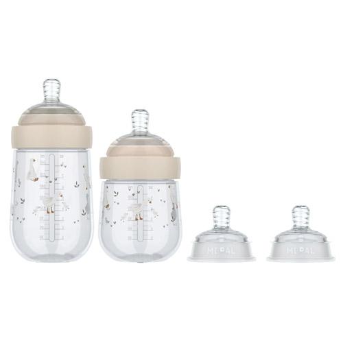 Ce coffret comprend deux biberons 165 ml et 240 ml et deux tétines à débit moyen, parfaites pour un allaitements en douceur et pour accompagner la croissance de votre bébé.