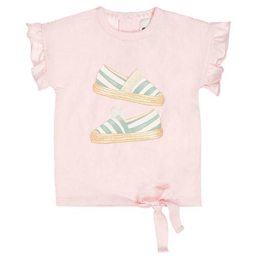 Les manches sont ornées de volants et un noeud en bas apporte une touche de douceur et de fantaisie à ce t-shirt pour fille.