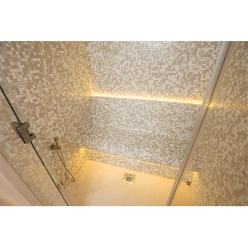 Wanden, plafond en banken, klaar voor tegels en afwerking.