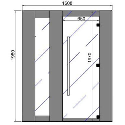 - Heldere deur uit veiligheidsglas 1970 mm x 650 mm x 8 mm met gelakte hang en sluitwerk in overeenstemming met de MDF kleur.