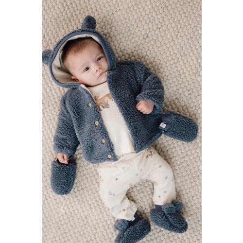Het is net zo warm als comfortale en heeft een Stone Blue teddy stof met lieve oren op de capuchon.