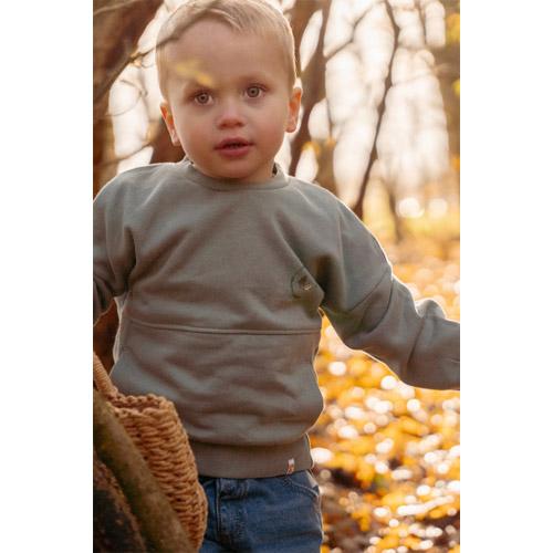 Voor kleintjes die altijd iets bij zich hebben (al is het maar een verzameling steentjes), is deze Forest Green trui de winter Essential !