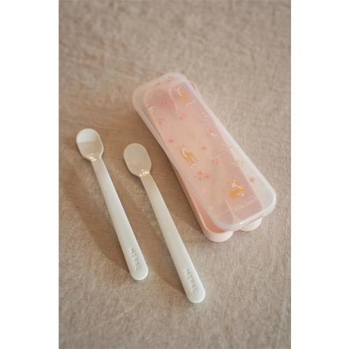 De lepels worden geleverd als set van twee in een handig opbergdoosje.