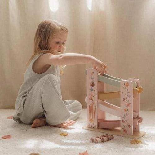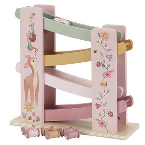De vier voertuigen van deze vermakelijke houten rollerbaan zijn elk versierd met tekeningen van schattige dieren uit het bos.