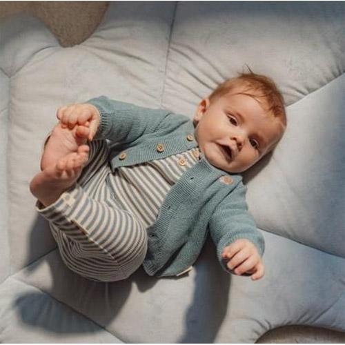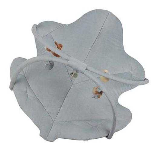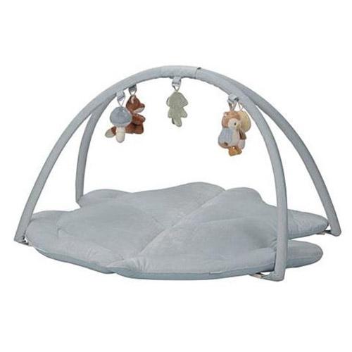 Het blauwe kleed heeft twee grote corduroy bogen waar vijf verschillende knuffeltjes uit de Forest Friends collectie aan hangen.