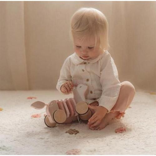 Gemaakt van stevig hout en versierd met kleurrijke ringen, biedt dit trekdier niet alleen eindeloos plezier maar bevordert het ook het lopen en de ontwikkeling van motorische vaardigheden.