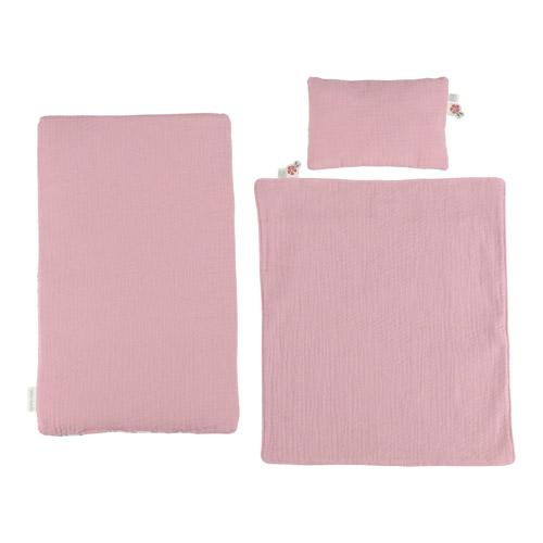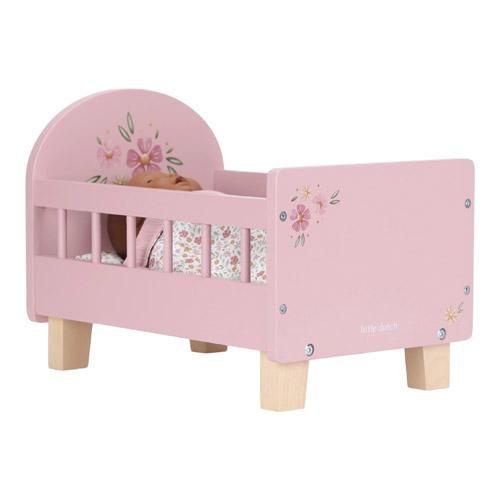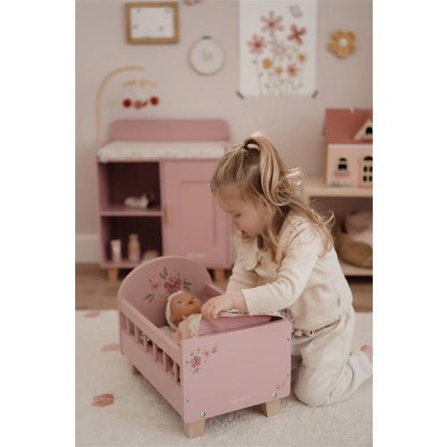 Het bedje wordt geleverd met een knus kussen, een warm dekentje en een zacht matrasje, allemaal in het betoverende Soft Flower dessin.